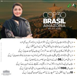 Earlier on Wednesday, CM Maryam Nawaz departed for Brazil to attend COP-30. On the sidelines of the conference, she is scheduled to hold a series of high-level engagements with global leaders and institutions, including the Vice Presidents of the Asian Infrastructure Investment Bank (AIIB) and the Asian Development Bank (ADB), as well as senior officials from the World Bank’s Climate Change division, the Global Green Institute, and the United Nations Development Programme (UNDP).