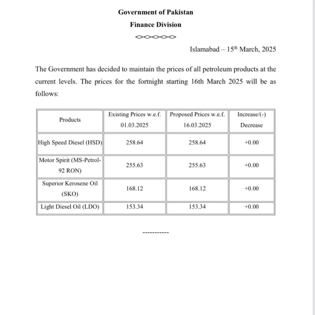 The government has decided to maintain the prices of all petroleum products at their current levels for the next fortnight, starting March 16, 2025, according to a notification issued by the Finance Division.