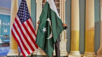 A State Department contractor adjusts a Pakistan national flag at the State Department in Washington on February 19, 2015. —…