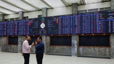 Two investors can be seen discussing in front of the digital stock board at the Pakistan Stock Exchange. — AFP/File…