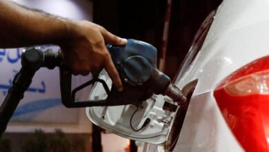 A worker holds a fuel nozzle to fills fuel in a car at petrol station in Karachi, on September 16,…
