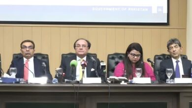 Finance Minister Muhammad Aurangzeb (second left) addresses a presser in Islamabad on November 3, 2025. — Screengrab Geo News Govt…