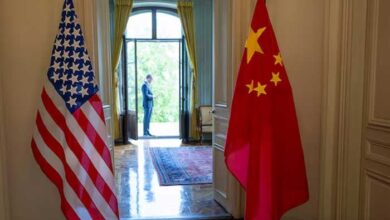 The US and Chinese flags are seen on the day of a bilateral meeting between the US and China, in…