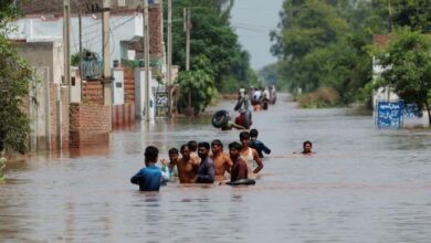 A man sits on a wooden table along a flooded street after the rain at Latifabad, Hyderabad, August 22, 2025. —…