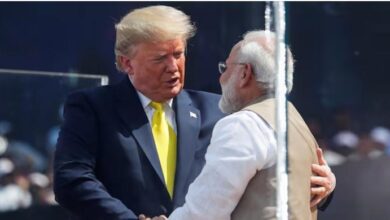 US President Donald Trump embraces with Indian Prime Minister Narendra Modi during the “Namaste Trump” event at Sardar Patel Gujarat…