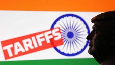 A 3D-printed miniature model of US President Donald Trump, the Indian flag and the word “Tariffs” are seen in this…