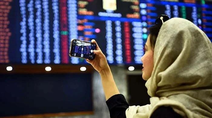 A woman takes pictures of the electronic board displaying data at the Pakistan Stock Exchange in Karachi, on December 21, 2022. — PPI