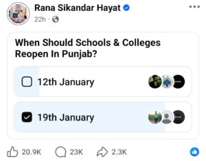 The Education Minister stated that “In view of the prolonged severe winter spell and the forecast of extremely low temperatures in the coming days, and on the advice of PDMA, the Government of Punjab has decided to extend winter vacations till 19th January for all Government and Private schools across the province, in order to ensure the health, safety and well being of students and staff”.