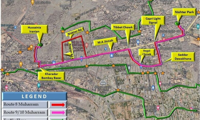 The Traffic Police have announced a special traffic plan for 8th, 9th, and 10th of Muharram. Under the plan, MA Jinnah Road will remain closed from Guru Mandir to Tower on all three days due to security concerns. The main Muharram processions will begin from Nishtar Park and conclude at Hussainia Iranian Imambargah, passing through its designated routes. Vehicles bearing special stickers issued for the procession will be allowed to join.